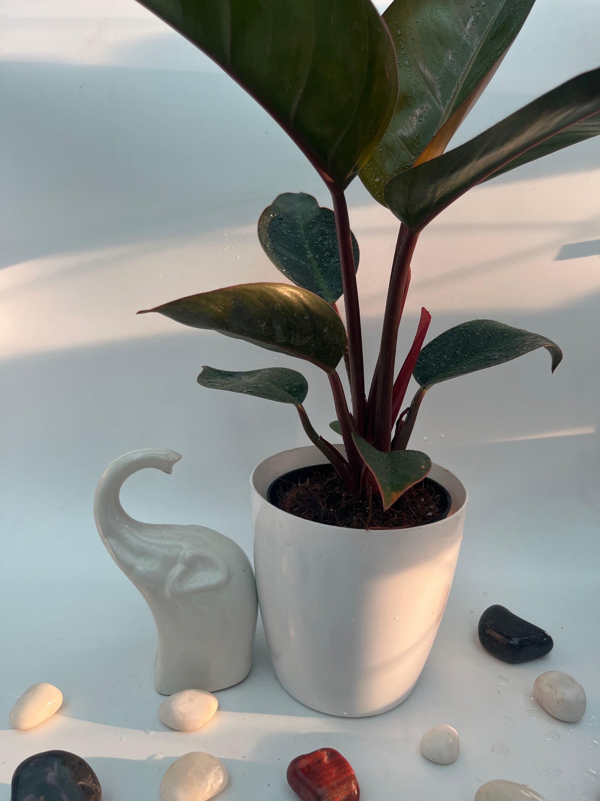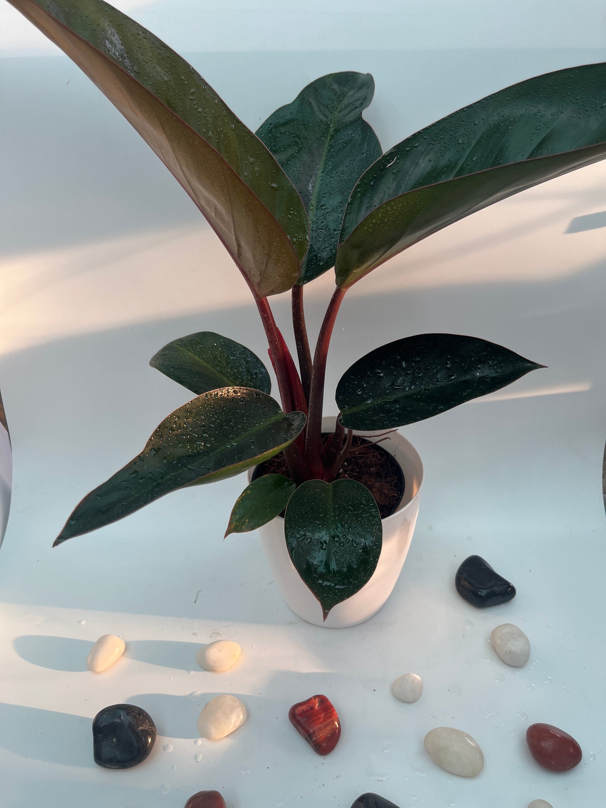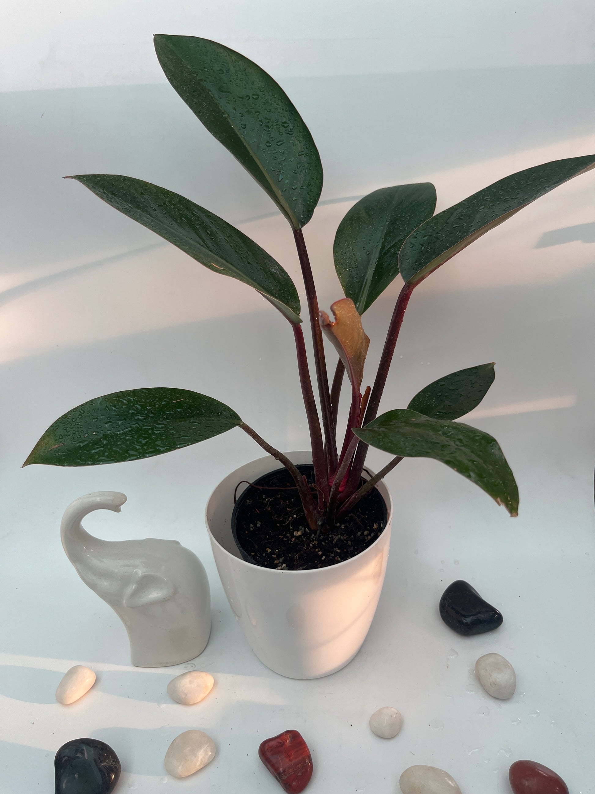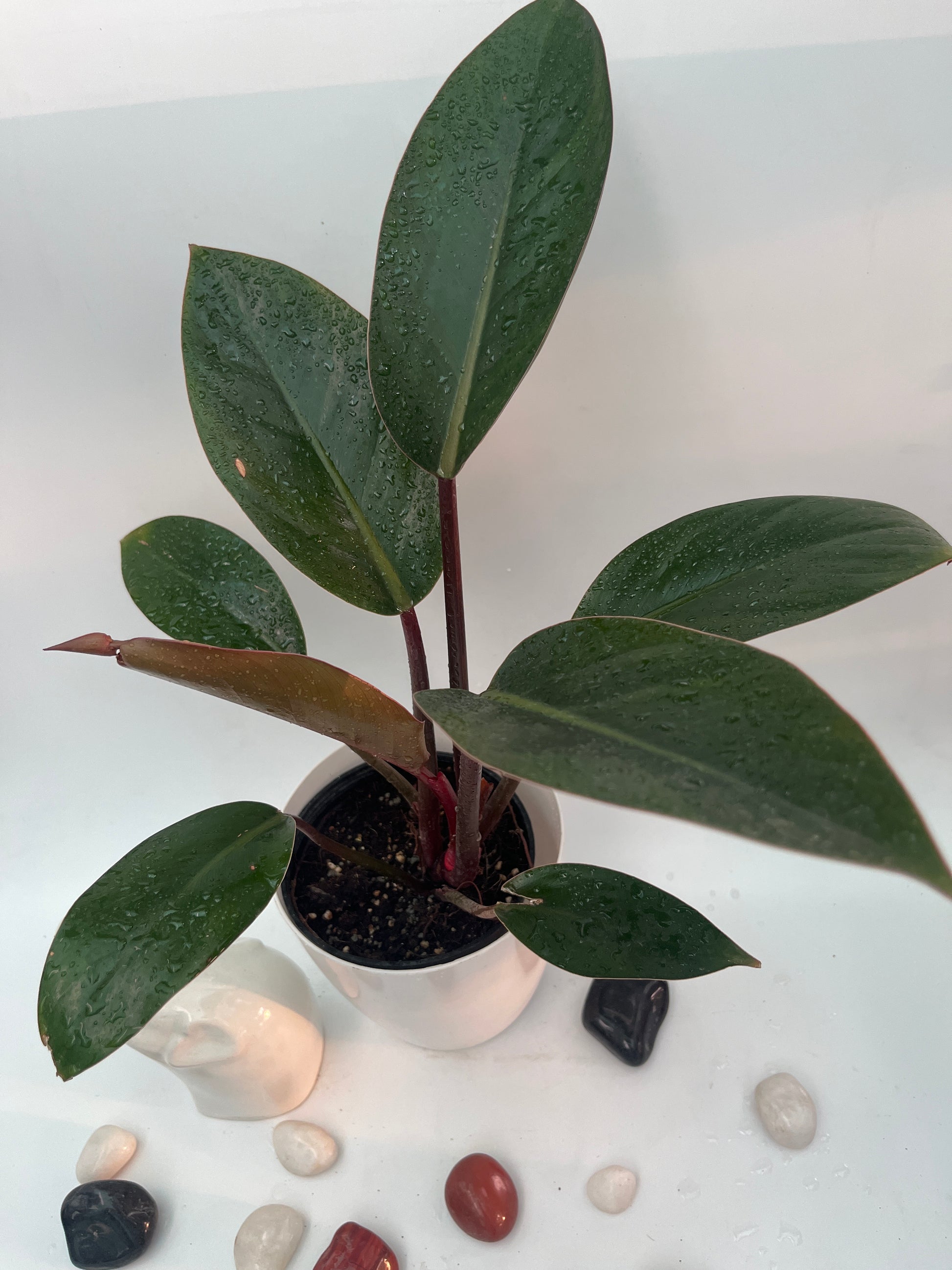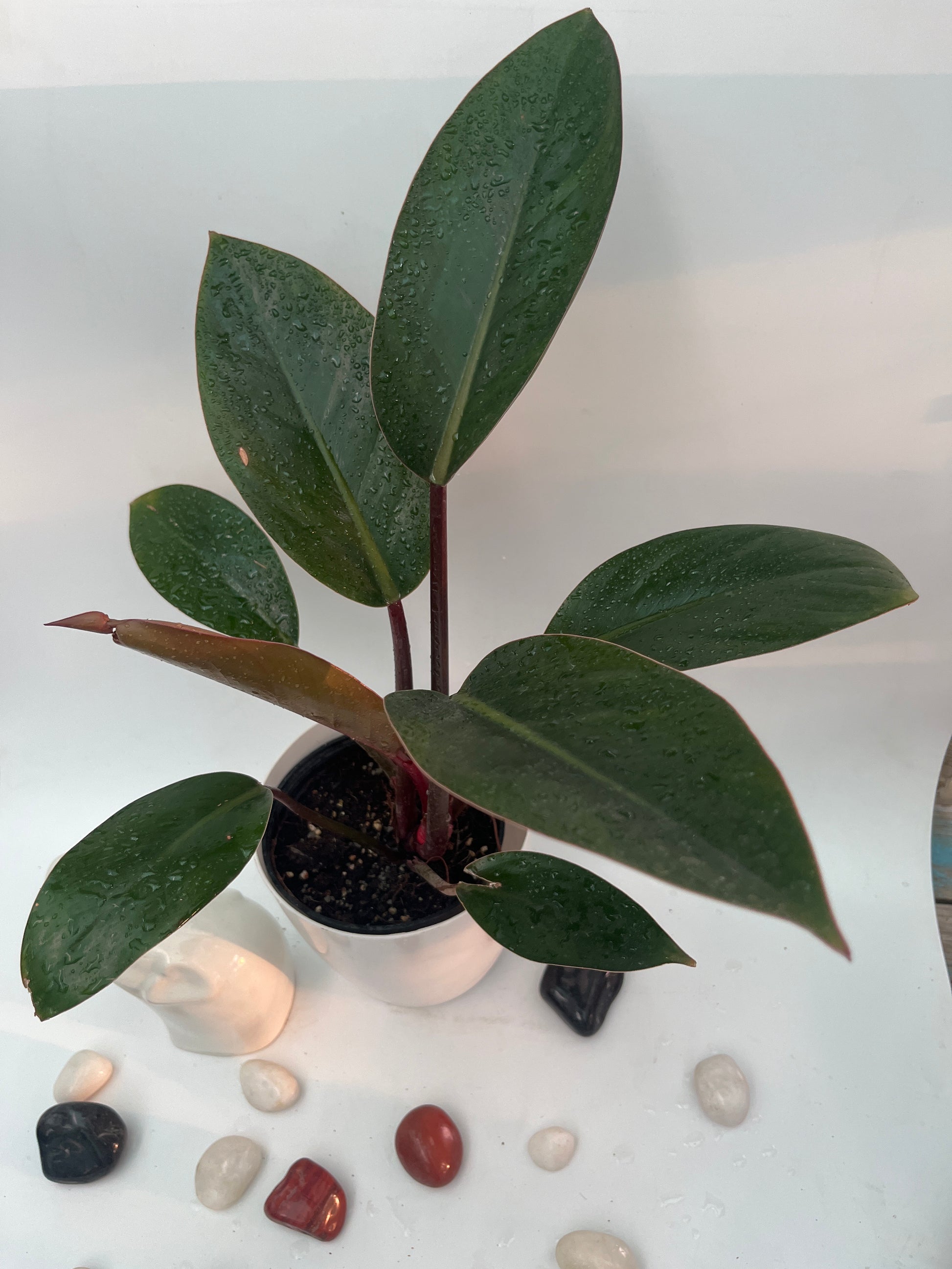 4. Likely refers to Philodendron Rojo Congo, an upright Philodendron with glossy, dark green leaves that emerge with a reddish or bronze hue.
