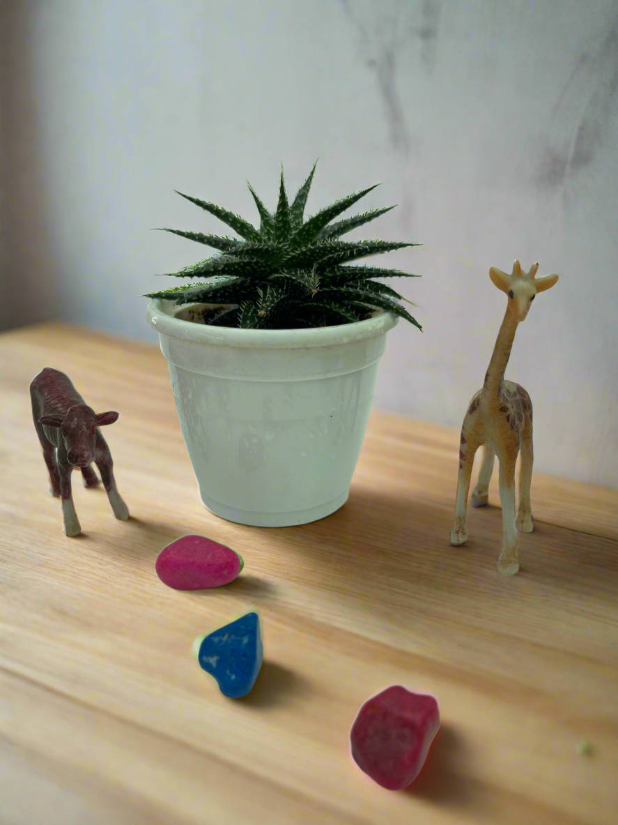 4. Succulent with fleshy, dark green leaves adorned with horizontal white stripes or bands.